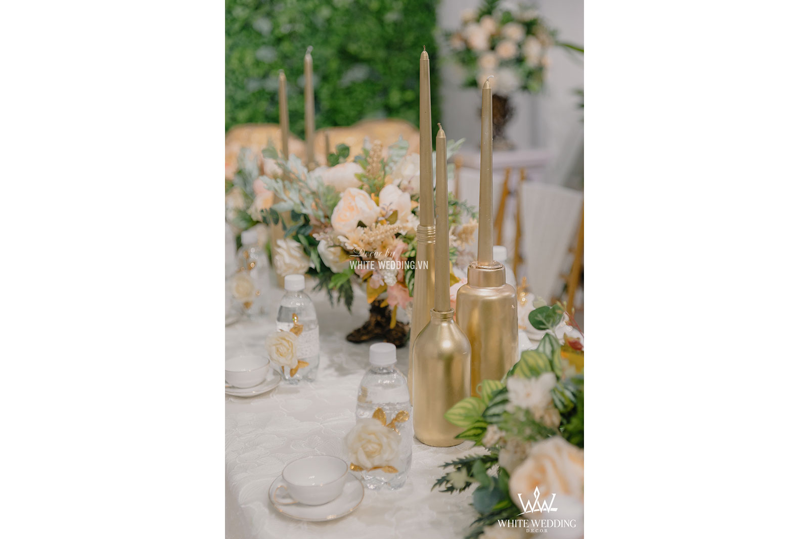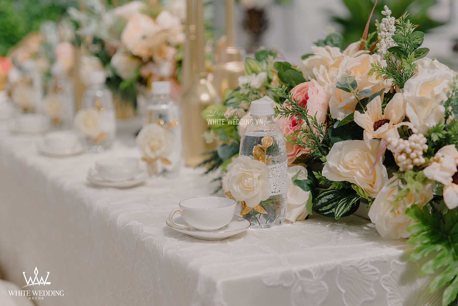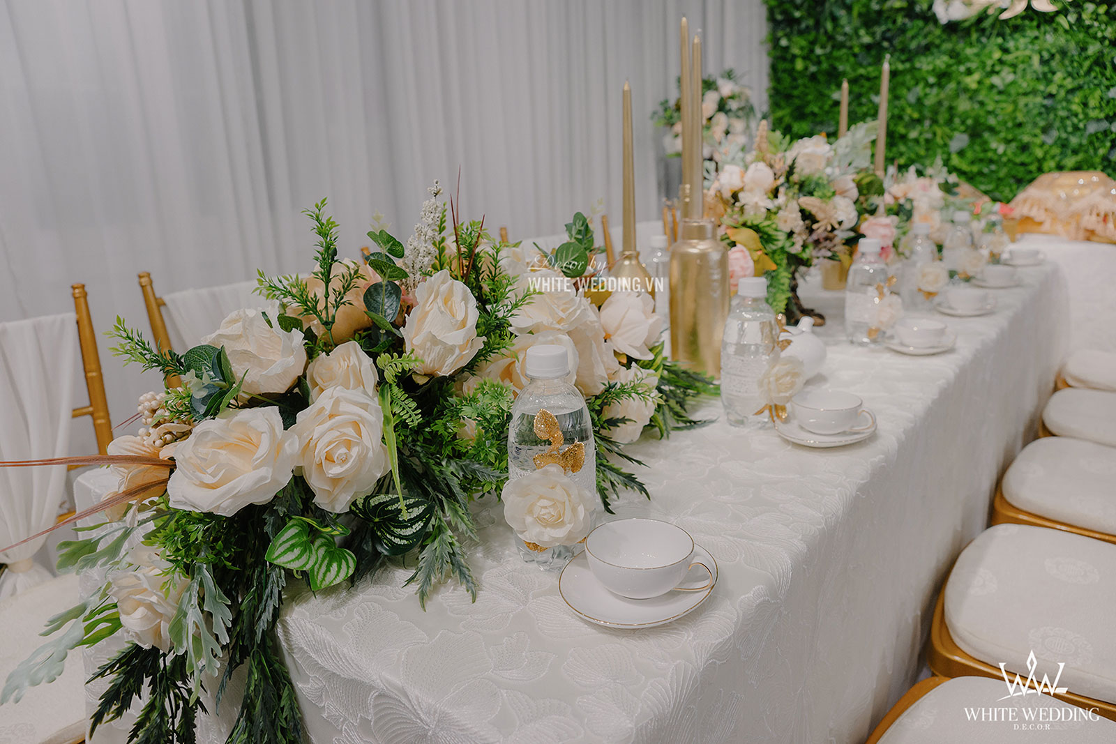 – Bàn dài 2m4 phủ vải cao cấp. – 01 Bình+ 02 cụm hoa+ 06 bình nến trang trí. – 12 ghế Tiffany trang trí voan + hoa. – 02 bộ ấm tách Minh Long cao cấp (2 ấm + 12 tách + 12 đĩa). ✔ Bảng tên CD – CR thiết kế2D ** 12 chai nước suối thiết kế hoa lụa. |