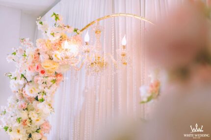 Pinky Princess - gây ấn tượng với thiết kế cổng hoa cưới phá cách vòng tròn được kết hợp độc đáo bằng những tone màu nhã nhặn như hồng pastel, trắng điểm xuyến trên những vật trang trí golden sang trọng và tinh tế. Tất cả tạo nên một không gian tiệc cưới hoàng gia thật lãng mạn và đẳng cấp. Gói trang trí nhà hàng bao gồm các hạng mục sau: – Backdrop – Sân khấu, – Catwalk – Bàn gallery