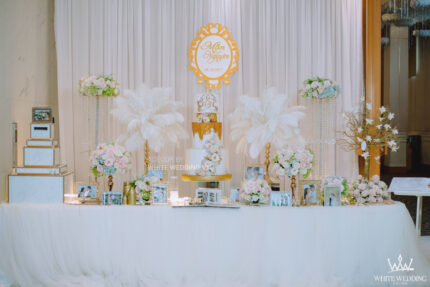 GOLD BOUGAINVILLEA - gây ấn tượng bởi backdrop phông nền trắng kết hợp với bông hoa giấy, tạo nên một không gian sang trọng. Một concept mang phong cách hiện đại và sang trọng cho Cô Dâu – Chú Rể thích sự mới lạ nhưng vẫn giữ được nét đẹp tinh tế.
